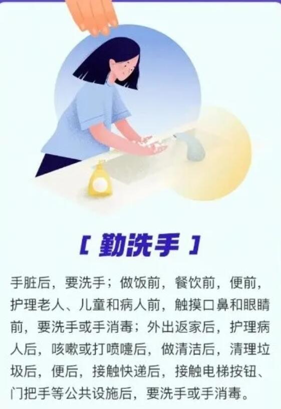 1.勤洗手。手臟后,要洗手;做飯前,餐飲前,便前,護理老人、兒童和病人前,觸摸口鼻和眼睛前,要洗手或手消毒;外出返家后,護理病人后,咳嗽或打噴嚏后,做清潔后,清理垃圾后,便后,接觸快遞后,接觸電梯按鈕、門把手等公共設施后,要洗手或手消毒。