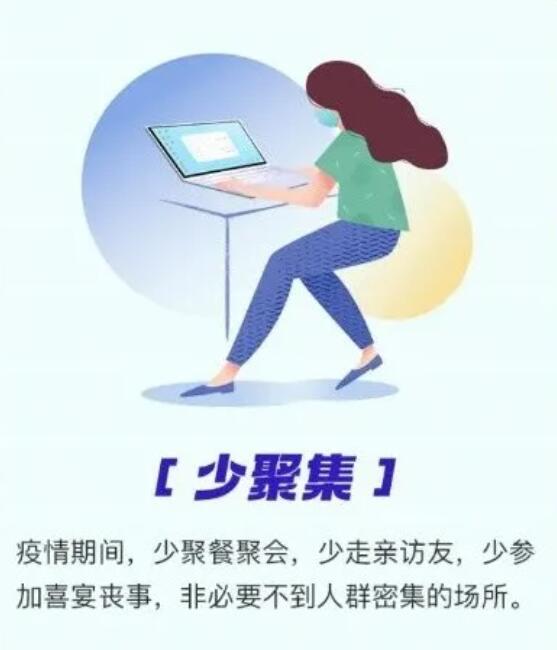 4.少聚集。疫情期間,少聚餐聚會,少走親訪友,少參加喜宴喪事,非必要不到人群密集的場所。