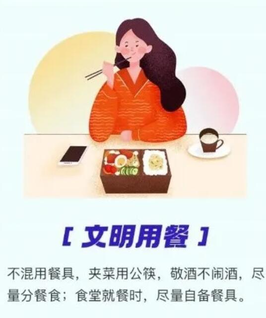 5.文明用餐。不混用餐具,夾菜用公筷,敬酒不鬧酒,盡量分餐食;食堂就餐時,盡量自備餐具。