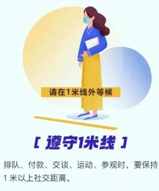 6.遵守 1 米線。排隊、付款、交談、運動、參觀時,要保持 1 米以上社交距離。