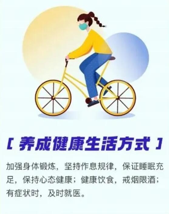 10.養(yǎng)成健康生活方式。加強身體鍛煉,堅持作息規(guī)律,保證睡眠充足,保持心態(tài)健康;健康飲食,戒煙限酒;有癥狀時,及時就醫(yī)。